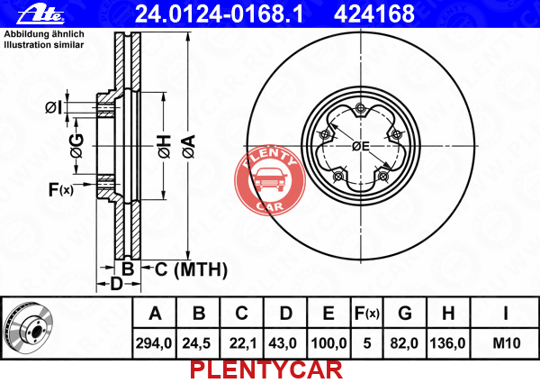 - ATE - 24-0124-0168-1 - 4041428;09.8837.14;NK-202544;BG3504;; - Торм.диск пер.вент.[294x24.5] 5 отв.[min2] - FORD Transit 2.0D/2.3/2.4D/TDI 3/00->