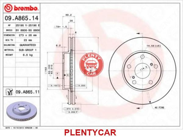 - BREMBO - 09.A865.14 - 0986479425;43512-02180;43512-12690;92163700; - Торм.диск передн.вентил.[273x26] 5 отв.[min 2] - TOYOTA Auris 1.4 D-4D [E15} 03.2007>