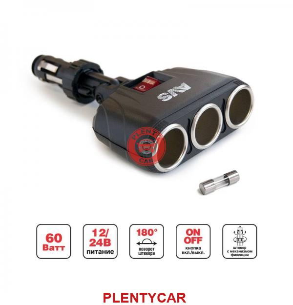 - Разветвитель в прикуриватель AVS (3 гнезда штекер, с тумблером CS316) - AVS - A80925S - - v0000002732 - - Питание: 12/24V Возможность подключения трёх приборов Плавкий предохранитель в корпусе штекера Штекер с механизмом фиксации Кнопка включения/выключения питания Возможность изменения угла наклона Изготовлен из высокопрочного тугоплавкого пластика Универсален для всех автомобилей